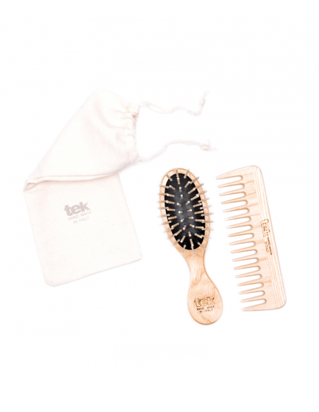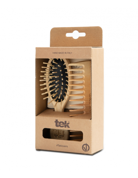 Spazzola + Pettine in Legno di Tek la confezione contiene la spazzola ovale e il pettine rado dalle misure adatte per portarle sempre con te in viaggio, in palestra o in borsa. Districa al meglio i tuoi capelli evitando l'effetto elettrizzato e senza spezzare o tirare i capelli.