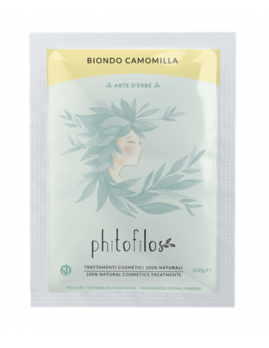 Biondo Camomilla di Phitofilos ti aiuta a coprire i capelli bianchi e decolorati con sfumature sulle tonalità del biondo, il colore ottenuto varia a seconda della base di partenza e dalla tempistica di posa.
