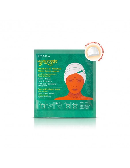Hyalurvedic Impacco Ayurvedico In Tessuto Fortificante - Methi, Maca, Hennè Neutro di Gyada Cosmetics è un impacco straordinariamente performante sui capelli per donarti un effetto equiparabile ai risultati professionali dei parrucchieri.