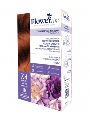 La Tinta Capelli 7.4 Biondo Medio Ramato di FlowerTint rivitalizza i tuoi capelli lasciandoli lucenti, copre totalmente i capelli bianchi senza ammoniaca, PPD e resorcina, sostanze dannose che causano anche l'odore caratteristico delle tinte tradizionali.