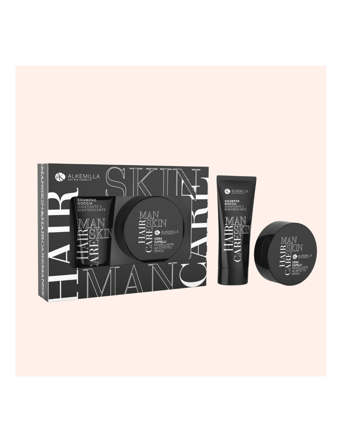 Box uomo Alkemilla per corpo e capelli con shampoo doccia e cera capelli. Un rituale pratico e quotidiano dalla profumazione legnosa e speziata, che deterge con delicatezza, idrata e dona morbidezza a pelle e capelli grazie ad Aloe, Olio di Mandorle e Calendula. Ideale per uso frequente e per tutti i tipi di pelle e capelli.
