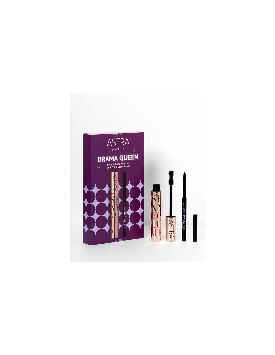 Set occhi Drama Queen con Sexy Volume Mascara e matita 24H Color Stain. Look intenso, volume estremo e tenuta prolungata.