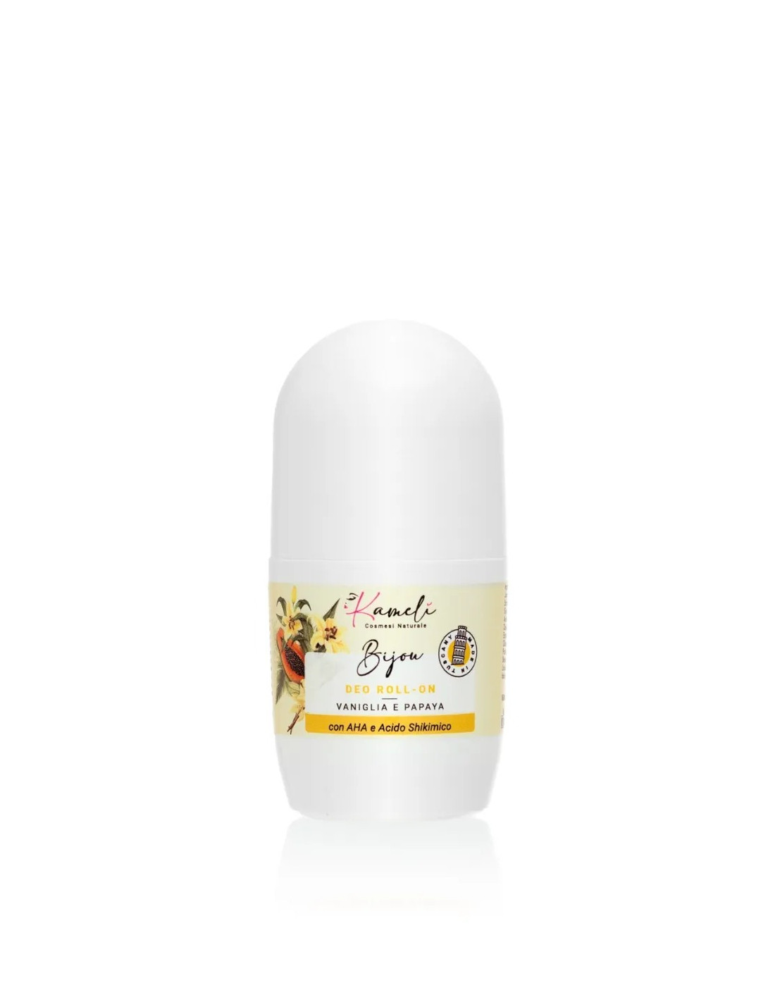 BIJOU - Deo Roll-On Vaniglia e Papaya di Kamelì è un innovativo deodorante dal tocco asciutto che non lascia macchie! Con una formulazione a base di AHA e Acido Shikimico evita la formazione e la proliferazione delle cellule sebacee responsabili del cattivo odore.