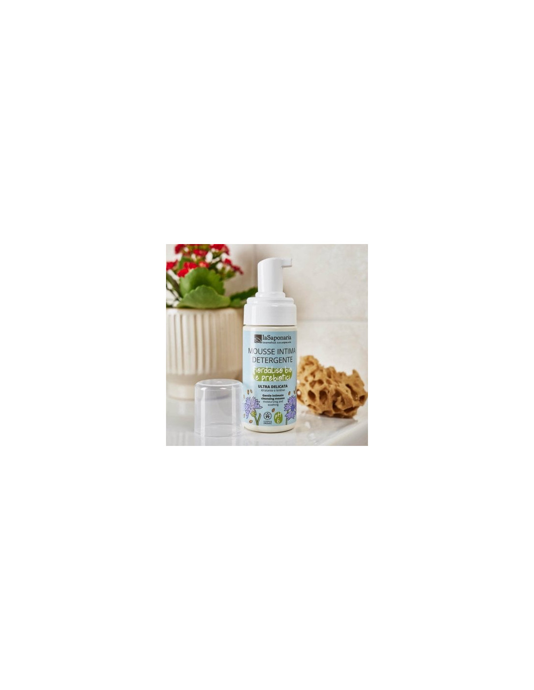 Detergente intimo in mousse con Fiordaliso bio, Aloe, Malva, Camomilla e Prebiotici. pH 6, ideale per bambini, menopausa e pelli intime sensibili.
