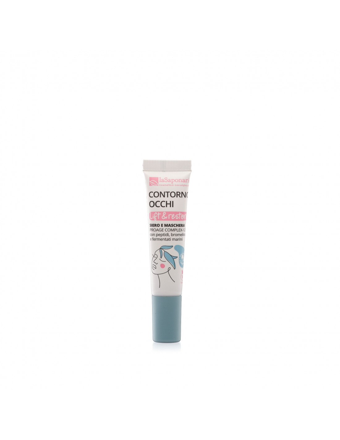 Il Contorno Occhi Lift & Restore di La Saponaria è certificato biologico dalla texture in gel. La sua ricchissima formula è in grado di schiarire e migliorare l'aspetto generale delle rughette del contorno occhi ma anche di quelle più profonde, conferendo un'aspetto disteso e luminoso dello sguardo! Con questo contorno occhi potrete andare a incrementare l' effetto lifting, l'elasticità cutanea ma anche aggiungere alla vostra routine il potere decongestionante sgonfiando la zona con un azione de-puff. Sguardo sveglio, rinnovato e aspetto generale del viso più giovane e meno stanco!