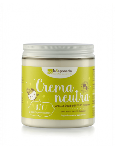 La Crema Neutra Base Viso E Corpo di La Saponaria è la crema multiuso formulata con aloe, burro di karité e olio di argan, risultando una crema base può essere arricchita con gli attivi che si preferiscono per personalizzarla ed adattarla alle proprie esigenze.
