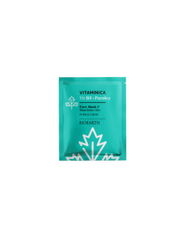 La Maschera Viso Vit B3 + Parsley di Bioearth della linea Pure & Clean è una maschera monouso imbibita di attivi ad effetto purificante e lenitivo. Con Prezzemolo e Niacinamide lavora sulle imperfezioni e lenisce al contempo irritazioni quali rossori dati da acne grazie alla preziosa presenza dell' estratto di Camomilla e Calendula nonché del succo di Aloe Vera. Adatta a pelli miste e impure regola la produzione di sebo. Ideale come regalo per te o per chi vuoi che ritrovi una pelle uniforme e prima di imperfezioni!