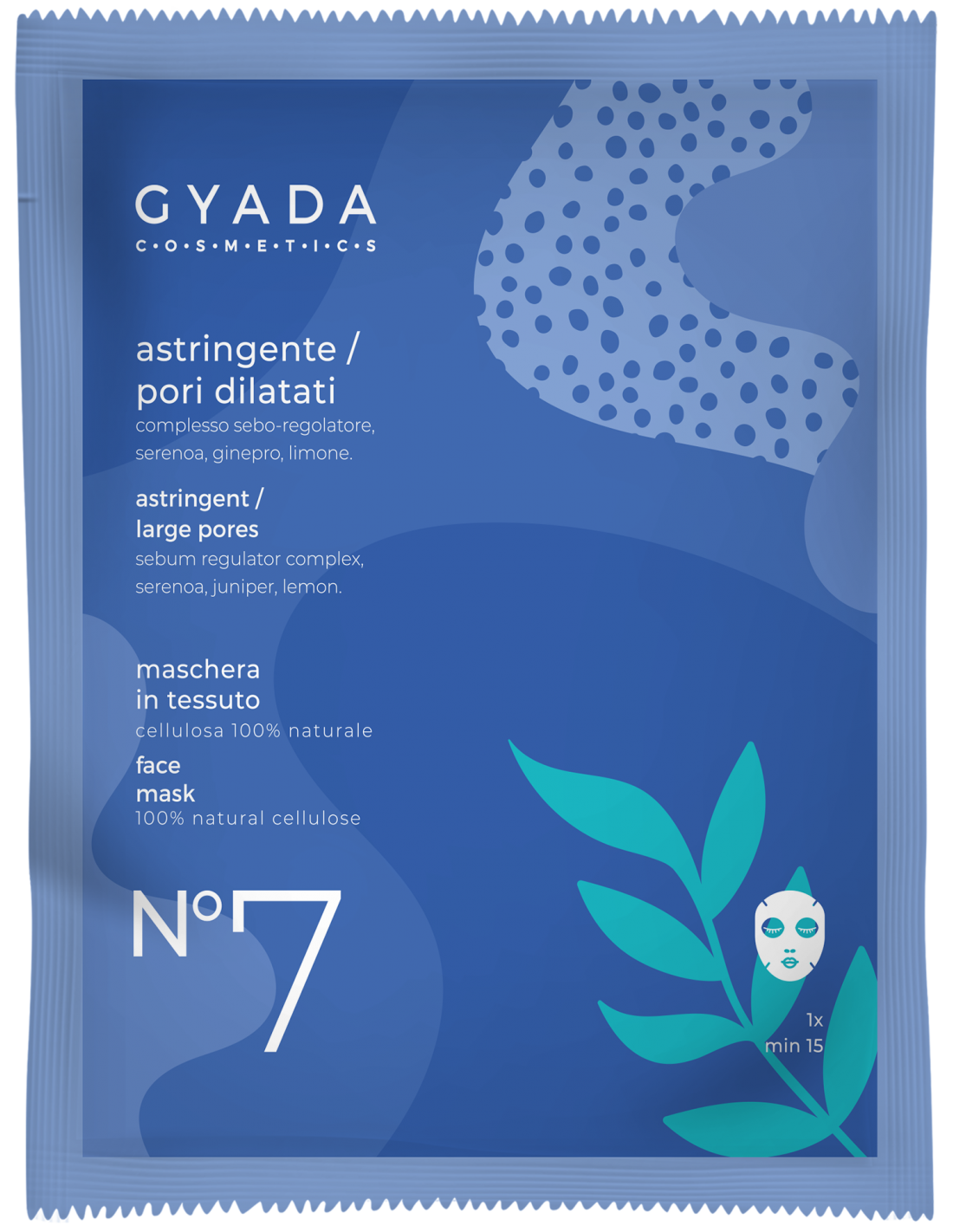 La Maschera in tessuto - N°7 Astringente/Pori Dilatati di Gyada a base di ingredienti naturali e biologici contrasta i pori dilatati e uniforma il tono della pelle. Realizzata in cellulosa 100% vegetale a base di ingredienti naturali, biologici, Vegan e Nickel free è ideale per pelli grasse e impure, dai pori dilatati. La sua preziosa formulazione contiene un complesso astringente costituito dall' estratto Glicerico di Limone e Rosmarino che agiscono in sinergia alla Serenoa e al Ginepro per una perfetta azione astringente, purificante e rinfrescante. La tua pelle sarà depurata, compatta e apparirà di conseguenza più uniforme e pulita.