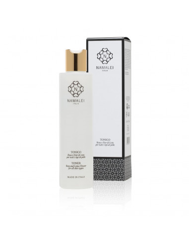 Il Tonico Rosa e Fior di Loto di Namalei è trattamento indispensabile dopo lo struccaggio, la sua azione è mirata per aiutare la pelle a ripristinare il pH cutaneo agendo come purificante negli strati più profondi.