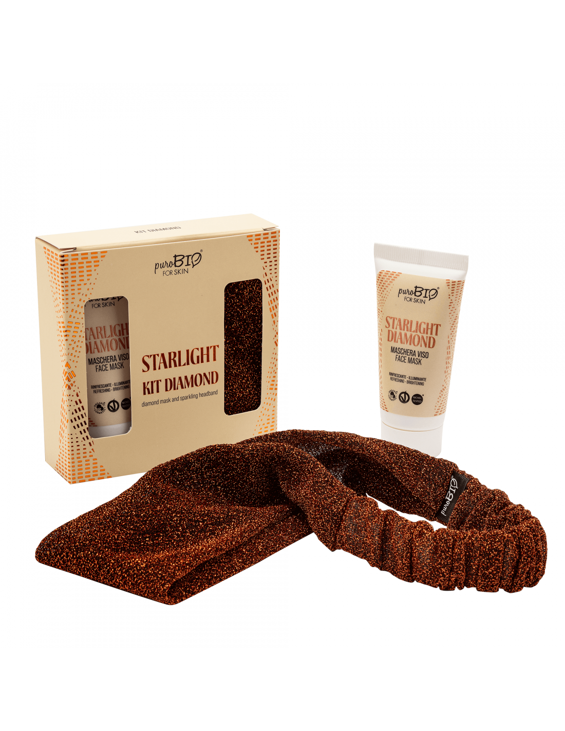 La Starlight diamond kit di PuroBio è un regalo lussuoso e scintillante perfetto per accompagnare le festive e fredde serate invernali. Il kit è composto dalla corposa Maschera Diamond per il viso ad azione illuminante e addolcente e la preziosa fascia per capelli in lurex color bronzo per eseguire una skincare con stile e praticità. Il suo packaging gold è perfetto per evitare ulteriori confezioni Natalizie e ideale per essere direttamente posizionato sotto l'albero per un effetto raffinato e scintillante.