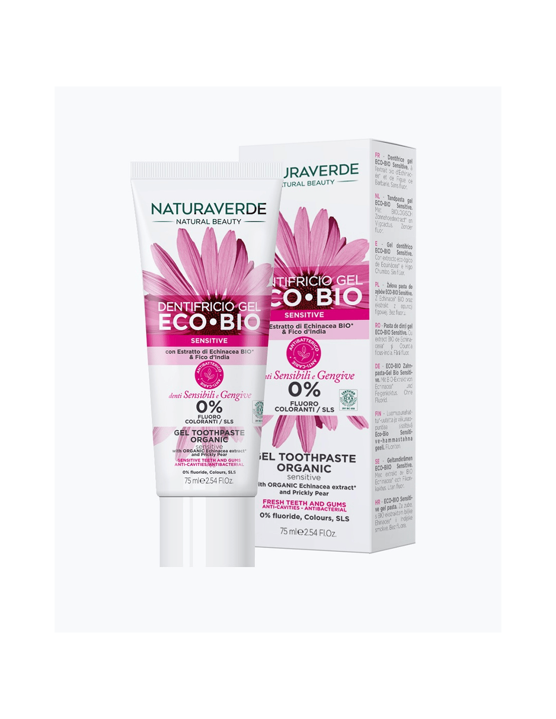 Dentifricio gel eco-bio Naturaverde Bio per gengive e denti sensibili, con Echinacea biologica e Fico d’India. Formula k,e anticarie, senza fluoro, delicata sulle mucose. Ideale per l’uso quotidiano di tutta la famiglia.