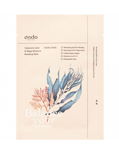 La HYALURONIC ACID & ALGAE Moisture Boosting Mask di Ondo Beauty 36.5 è una maschera in tessuto biodegradabile è l'ideale per chi ha la pelle disidratata e vuole ottenere una pelle illuminata e idratata, la famosa "glass skin". "Chok-Chok" è un'espressione coreana popolare che descrive una pelle radiosa e altamente idratata. Questa Contiene acido ialuronico, estratto di alghe e l'88% di acqua di amamelide, come principale ingrediente attivo, che aiuta a lenire la pelle, detergere e minimizzare i pori dilatati. Il Complesso di Piante Marine con 7 tipi di estratti di Alghe e Narciso Marino (pianta marina), arricchisce la pelle di nutrienti vitali. La niacinamide, un derivato della vitamina B3, calma e illumina la pelle e previene la comparsa di macchie scure. Aquaxyl aiuta ad ottimizzare il flusso di idratazione della pelle, controlla la circolazione e le riserve idriche, fornendo un'azione "scudo anti-disidratazione" con effetti visibili in 8 ore.